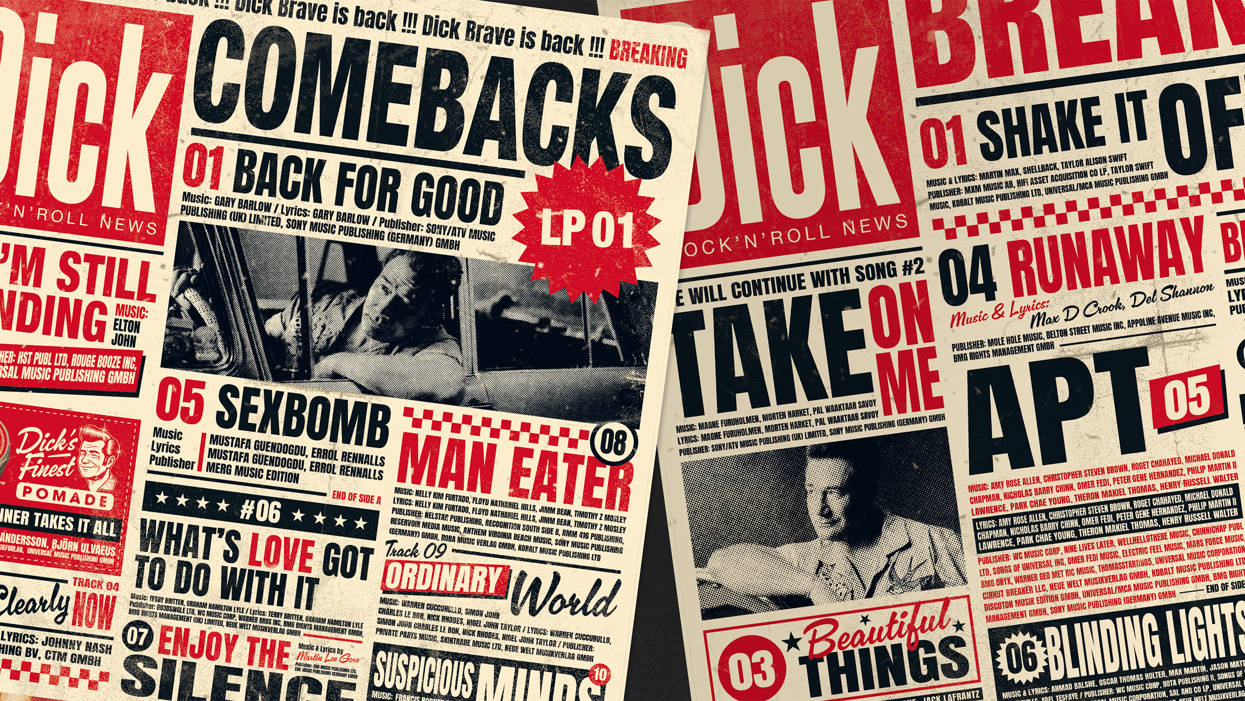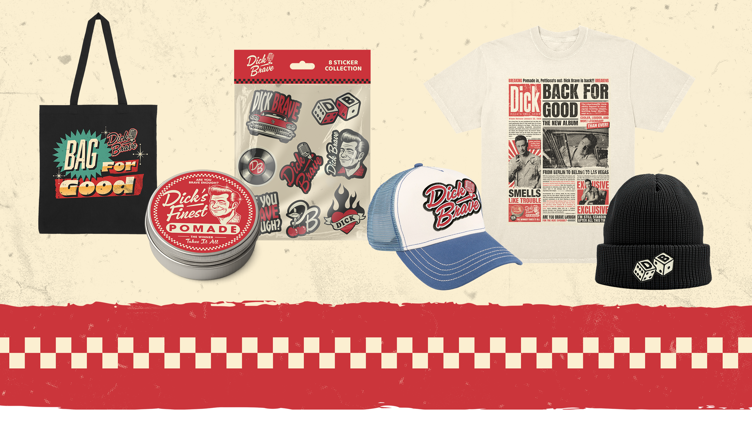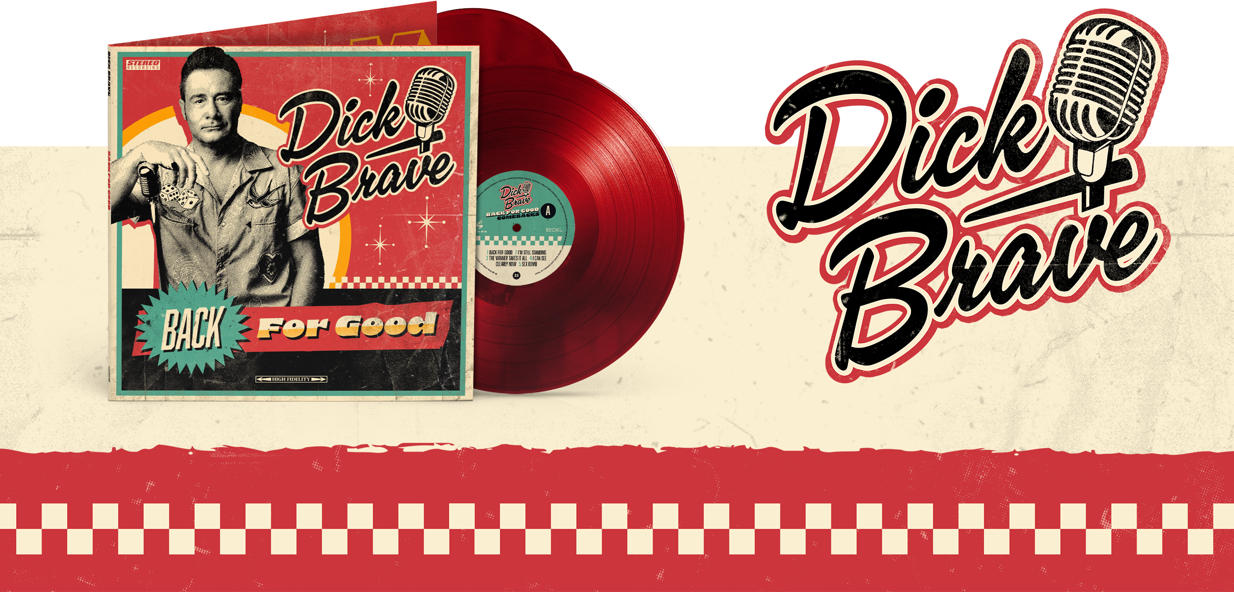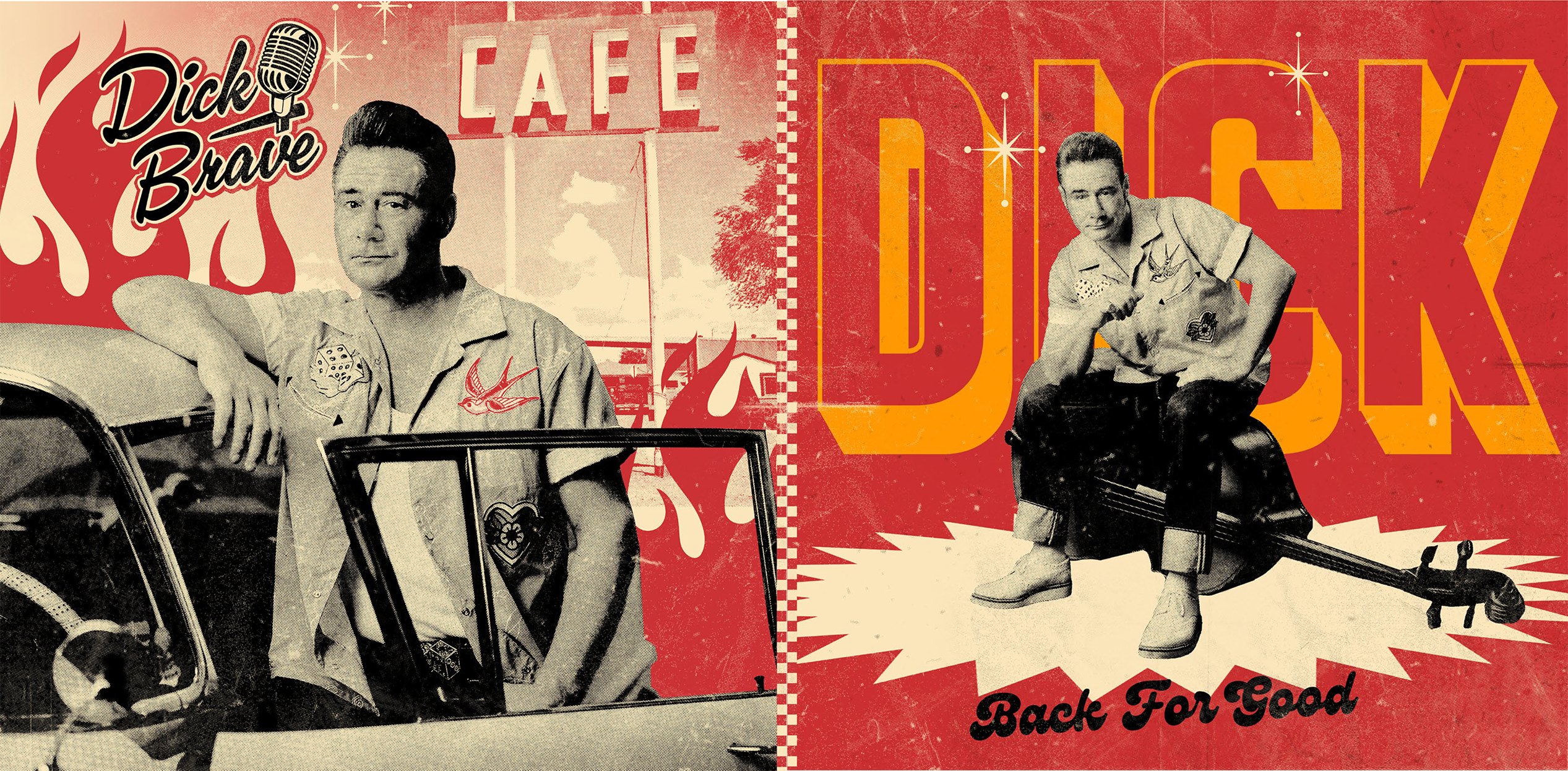 Für das Comeback von Dick Brave und sein neues Album „Back for Good“ entwickelten wir die komplette visuelle Identität dieses kraftvollen Neustarts. Ziel war es, die unverwechselbare Rockabilly-Energie des Projekts in eine konsistente Designsprache zu übersetzen – verwurzelt in Retro-Ästhetik, zugleich präzise und zeitgemäß umgesetzt.